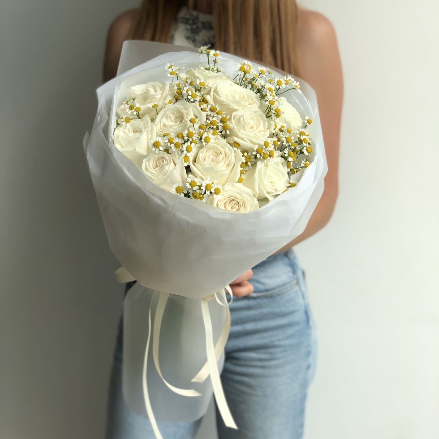 —ДУОБУКЕТ ИЗ ПИОНОВИДНЫХ РОЗ И РОМАШЕК