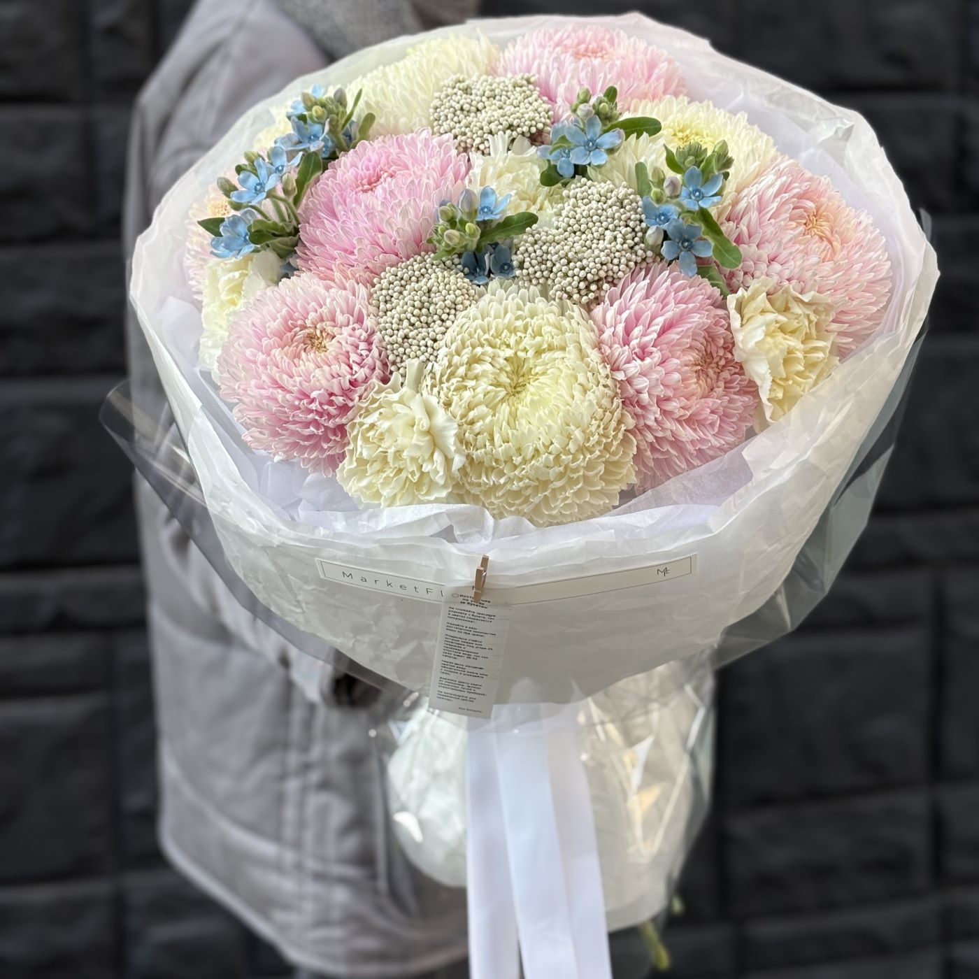 БУКЕТ ИЗ ХРИЗАНТЕМ И ОКСИПЕТАЛУМА