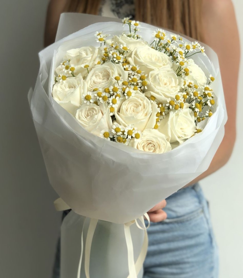 —ДУОБУКЕТ ИЗ ПИОНОВИДНЫХ РОЗ И РОМАШЕК