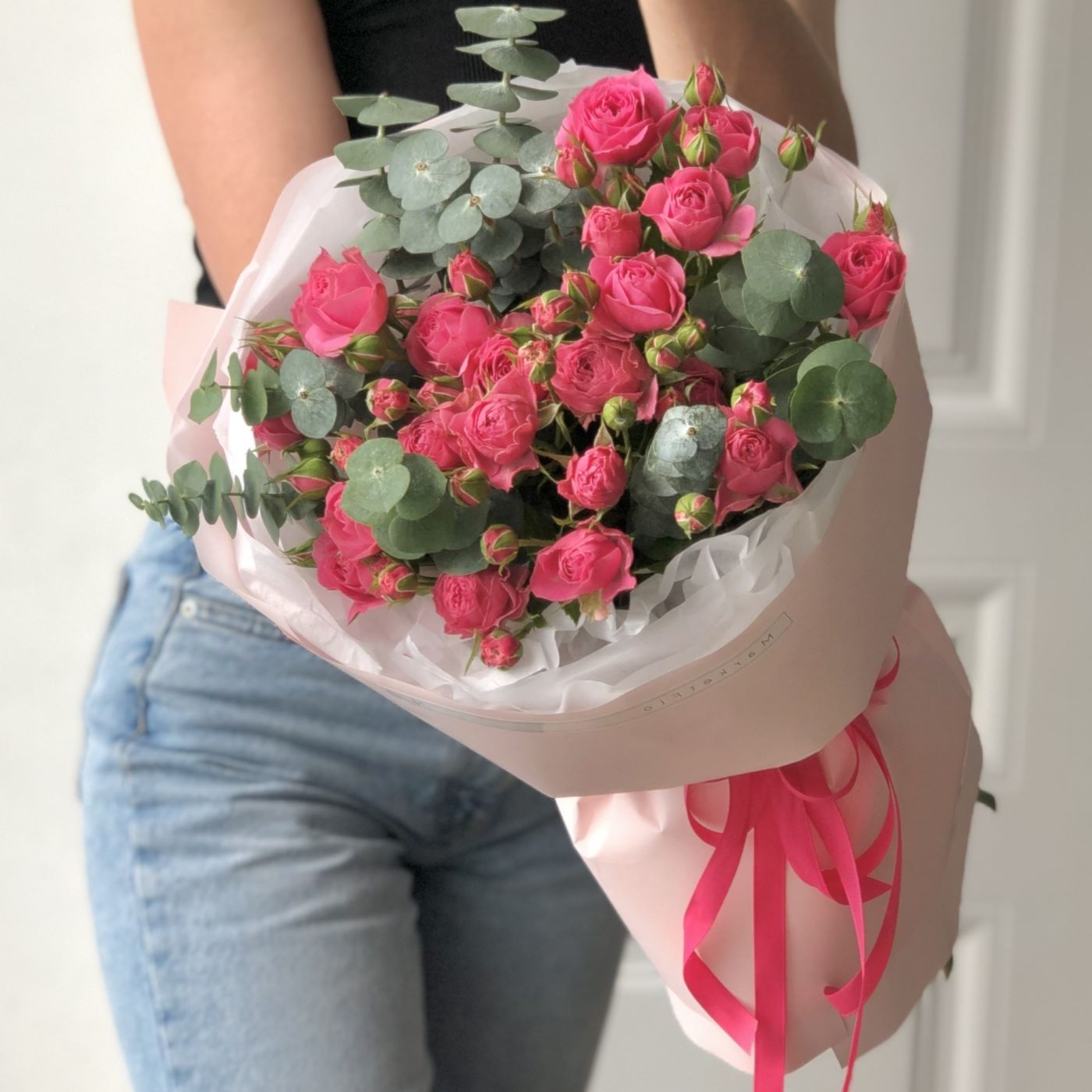 БУКЕТ ИЗ КУСТОВЫХ РОЗ И ЭВКАЛИПТА