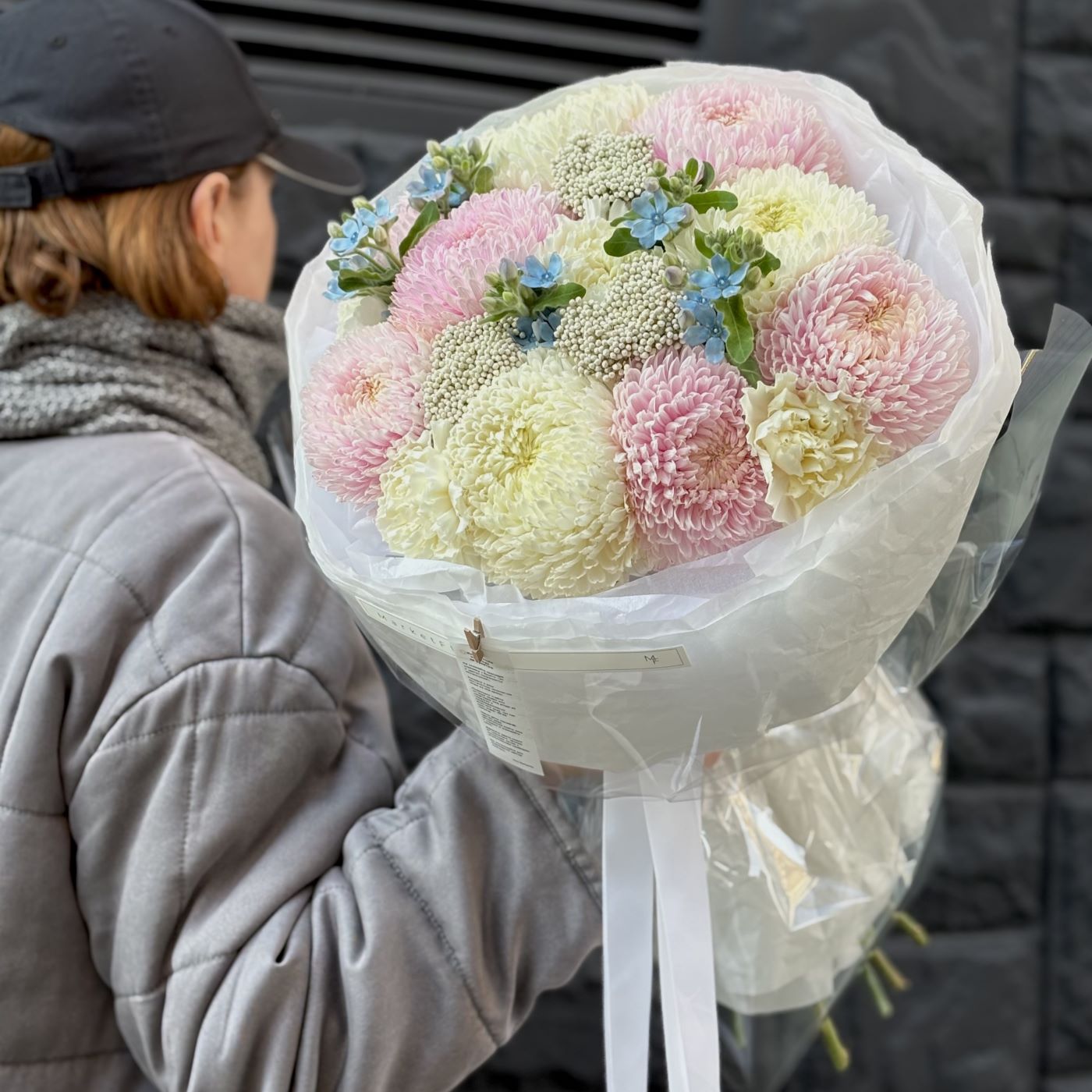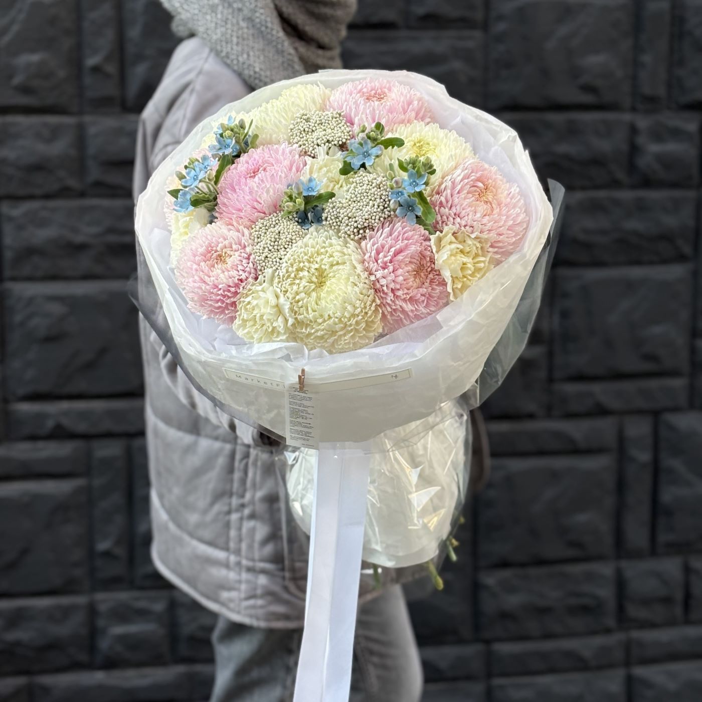 —БУКЕТ ИЗ ХРИЗАНТЕМ И ОКСИПЕТАЛУМА